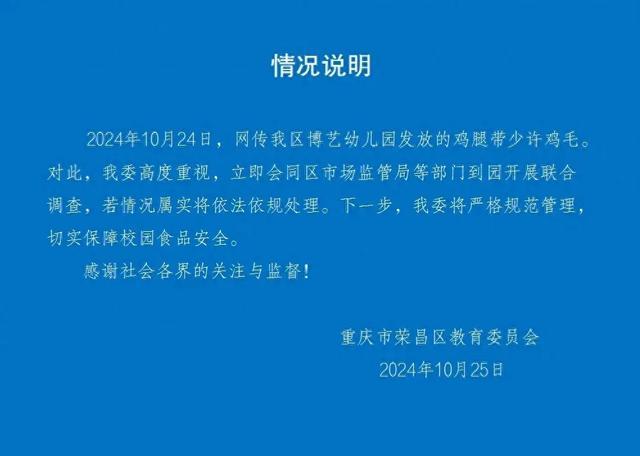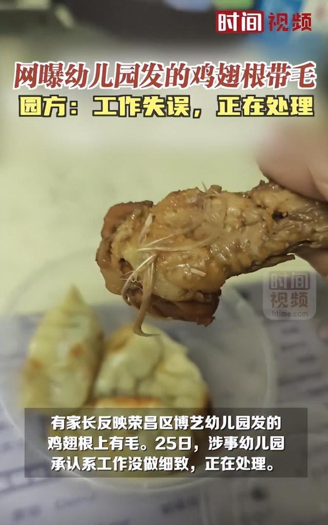 10月24日,重庆荣昌区一幼儿园学生家长邹女士在社交平台上发布视频称,幼儿园给自己孩子发放的鸡腿上还带有鸡毛。